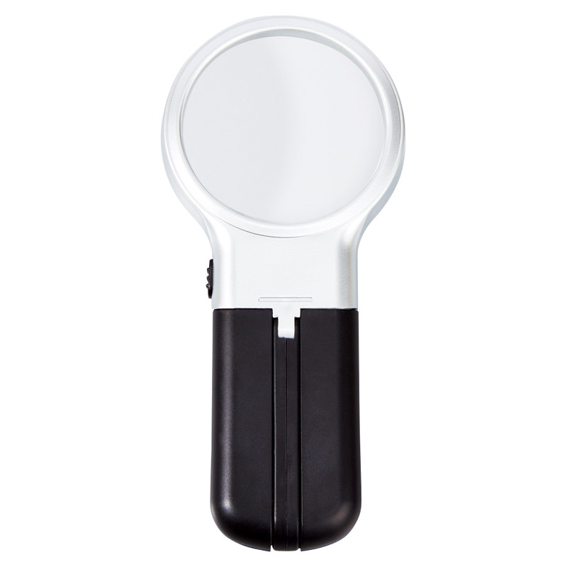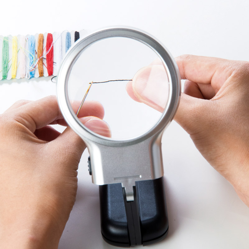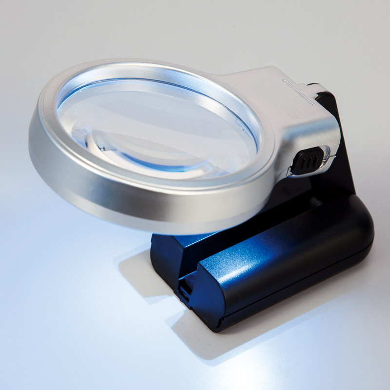 暗所でも見やすいライト付きルーペ。スタンド式に変形でき、2か所で角度調整できます。