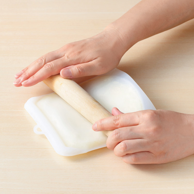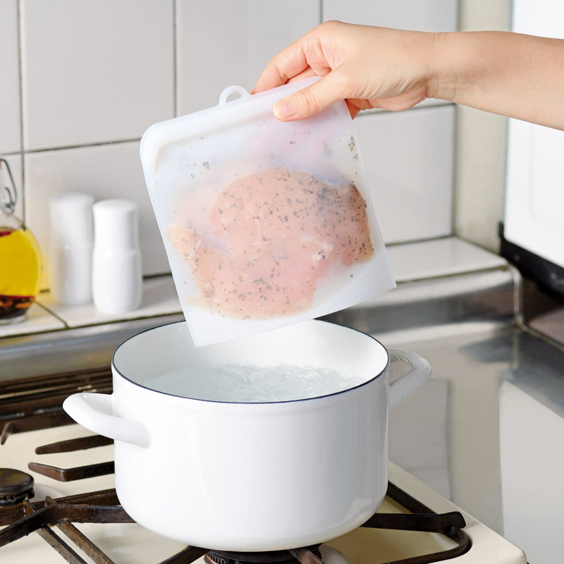 温め、蒸す、潰す、漬ける、低温調理、冷蔵、冷凍に使えるシリコーンバッグ。繰り返し使えるので経済的です。フック付で調理の取り出しや収納に便利。