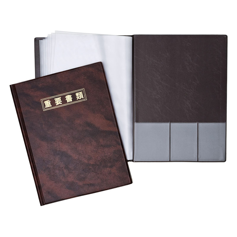 非常に高級感のある重要書類入です。A4用紙が入る中袋が10枚、表紙裏にA5ポケットと名刺ポケットが3つ付いてます。