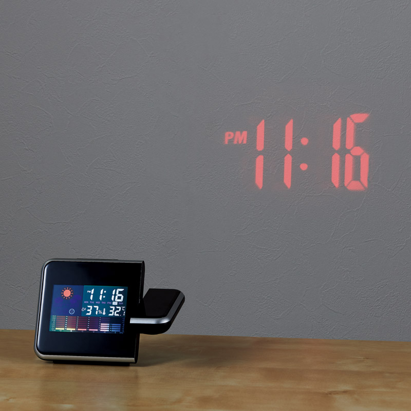 | コピー | 天井や壁面にプロジェクターで時刻を映しだす事ができる多機能クロック。時計、アラーム、スヌーズ、カレンダー、温度計、湿度計、気温変化グラフ、天気予報、時刻プロジェクター機能、バックライト。 |