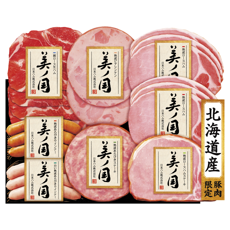 | 内容 | 熟成ロースハム(約45g)×2、熟成ロースハムステーキ(約50g)・肩ロース生ハム(約30g)・熟成ビアシンケン(約40g)・熟成あらびきステーキ(約47g)・熟成あらびきウインナー(約60g)・白い熟成あらびきウインナー(約60g)×各1 |