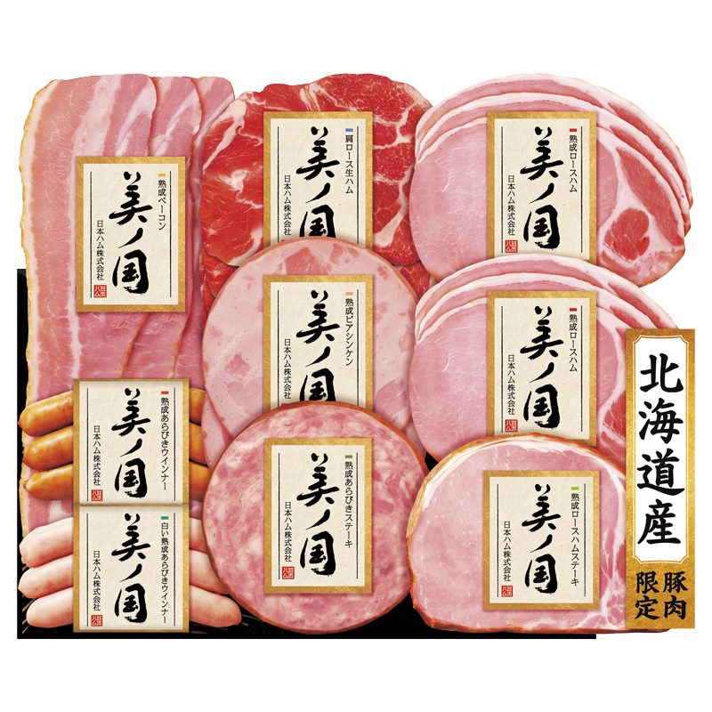 | 内容 | 熟成ロースハム(約45g)×2、熟成ロースハムステーキ(約50g)・熟成あらびきステーキ(約47g)・熟成ベーコン(約48g)・肩ロース生ハム(約30g)・熟成ビアシンケン(約40g)・白い熟成あらびきウインナー(約60g)、熟成あらびきウインナー(約60g)×各1 |
