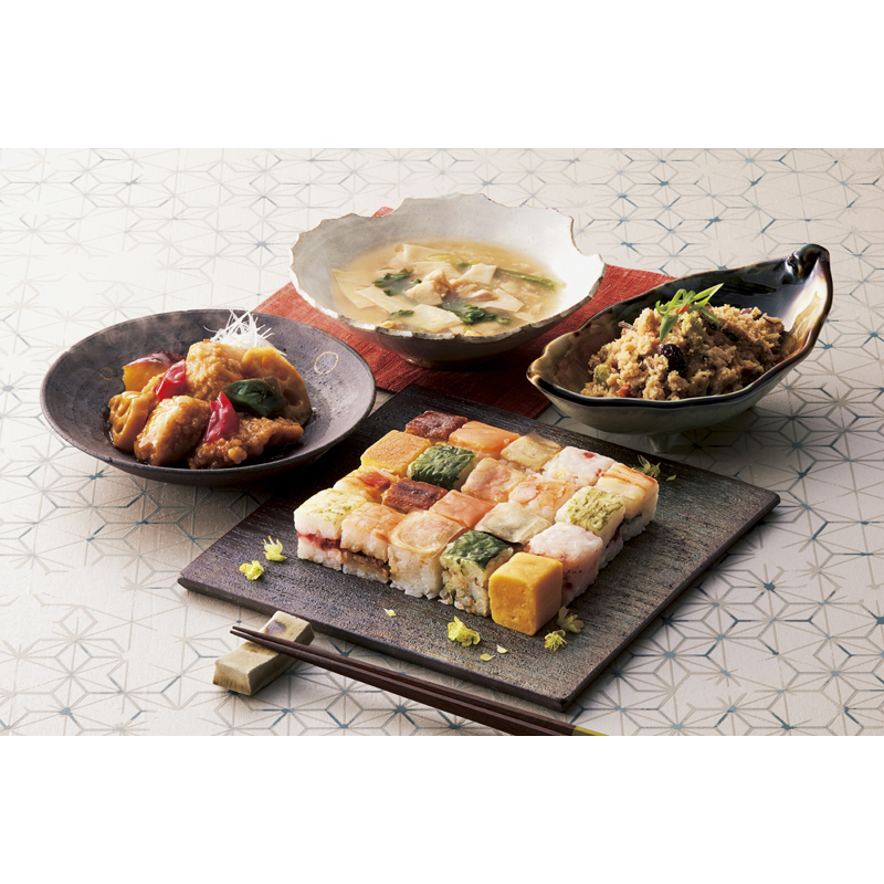 | 内容 | なみはや寿司(鯖・海老・サーモン・穴子・鯛・昆布・カニ・大根酢〆・高菜×各2、玉子・玉子焼き(ごはん無し)×各1)・九種の具材の田舎おから煮(約150g)・湯葉と長州鶏の和風あん(約150g)・長州鶏湯葉唐揚げと彩り野菜の黒酢あん(約150g)×各1 |