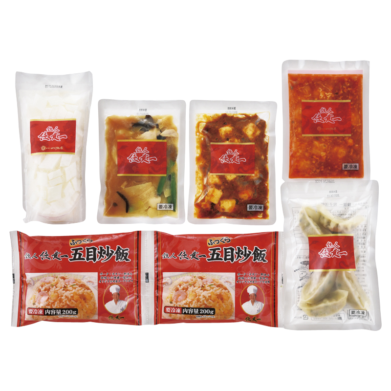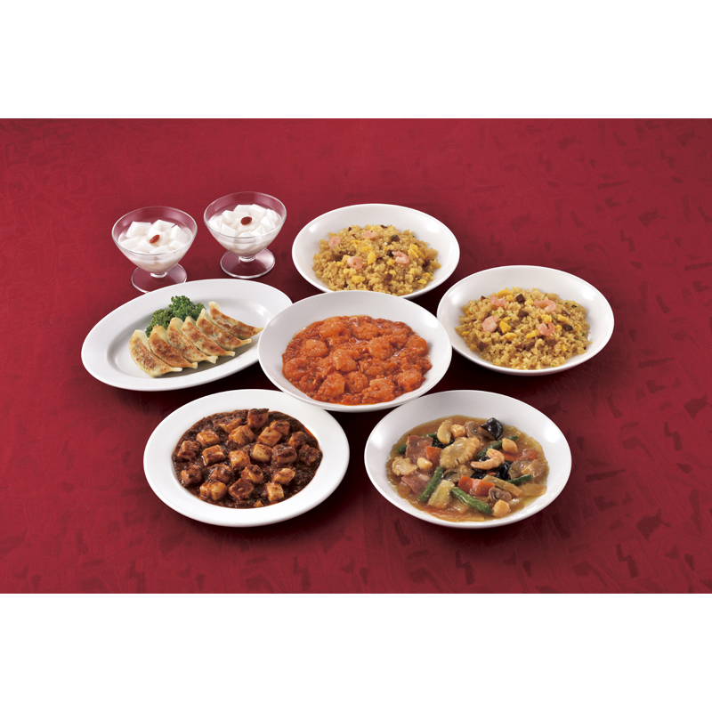 | 内容 | 餃子(6個入)(約120g)・本格四川麻婆豆腐(約150g)・乾焼蝦仁(エビチリソース)(約150g)・本格八宝菜(約150g)・杏仁豆腐(約500g)×各1、ふっくら五目炒飯(約200g)×2 |