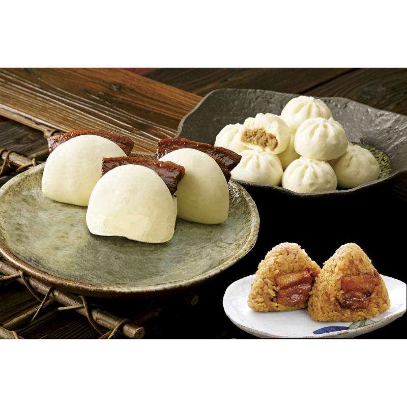 人気のミニ豚まんに角煮を挟んだ角煮まんじゅう、煮汁で味付けおにぎりに角煮をのせた詰合せです。