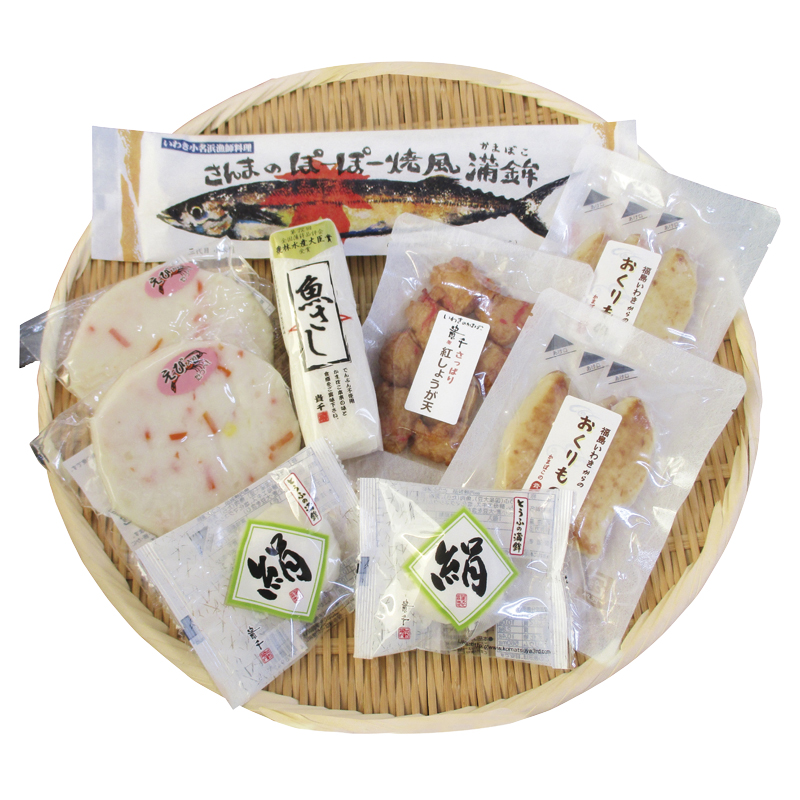 | 内容 | 白蒸しかまぼこえび(約90g)・とうふの蒲鉾絹(約30g)・いわきからの贈り物(キンキ焼かまぼこ3枚)(約60g)×各2、魚さし(約100g)・さんまのぽーぽー焼風蒲鉾(約90g)・揚げかまぼこ紅しょうが天(約80g)×各1 |