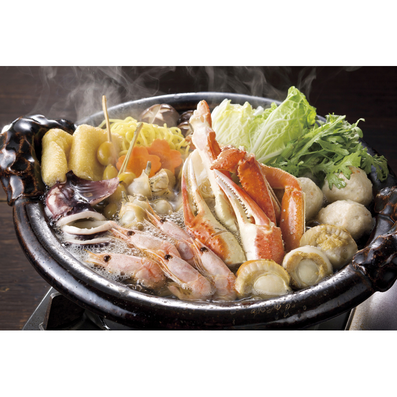 | コピー | 「ずわいがに」をはじめ「海老」や「帆立」などの魚介を詰め合わせ、各素材の旨味が活きる塩仕立ての鍋に仕上げました。シメは残りたれに「ラーメン」を入れてお楽しみください。 |