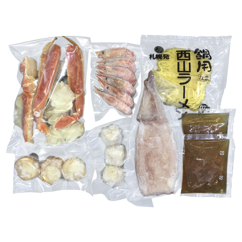 | 内容 | ボイル海老(約6g)×6、ボイル帆立(約20g)・かに入つみれ(約20g)×各3、ゆでずわいがにカット(約200g)・ツボ抜きいか(約100g)・冷凍生ラーメン(約80g)×各1、たれ(濃縮:塩仕立て)(約50ml)×2 |