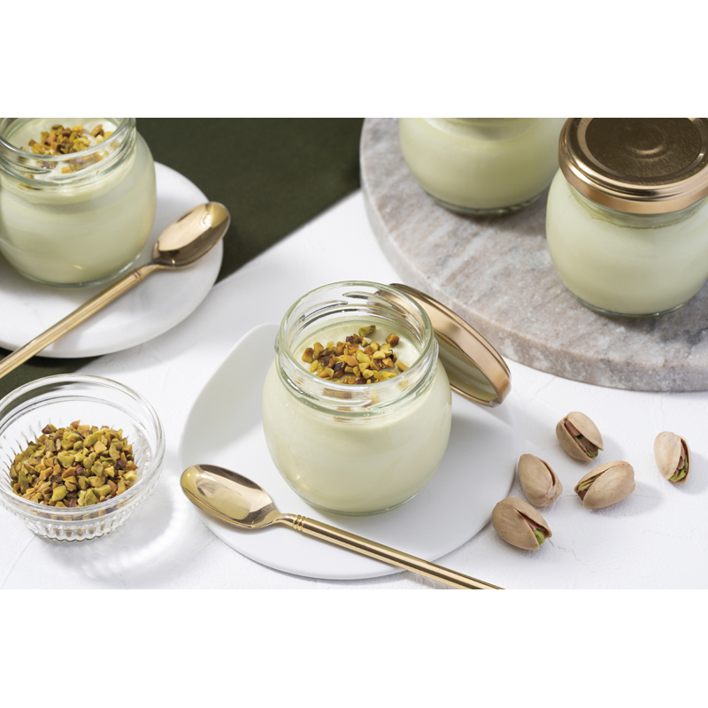 奥深いグリーンと上品なピンクの色ムラから醸し出される風味を活かしたなめらかなプリンに、ダイスクラッシュしたピスタチオをあわせて食感も楽しめるよう工夫しました。