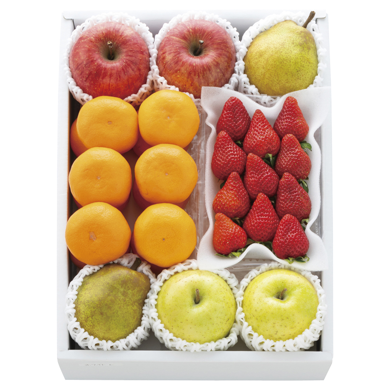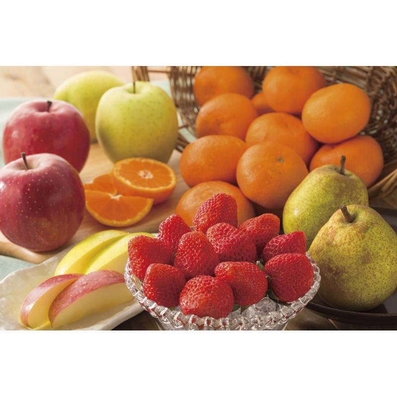 季節のイチゴ(約240g)、サンふじりんご(約250g)・王林りんご(約250g)・ラ・フランス(約250g)×各2、有田みかん(約1kg)