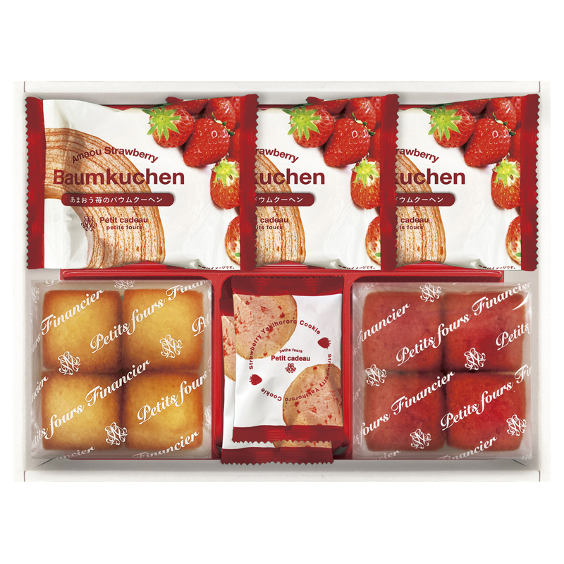 | 内容 | あまおう苺バウムクーヘン×3、プチフィナンシェ4個入(あまおう苺・プレーン)×各1、焼きほろろクッキー(イチゴ)×2 |