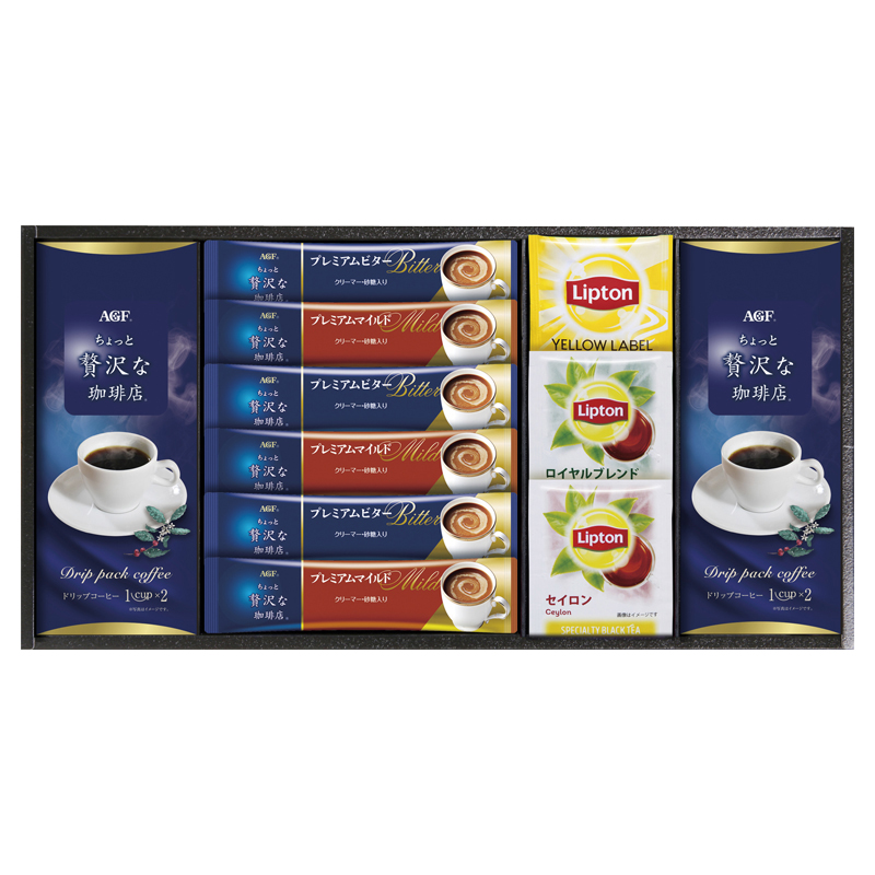 | 内容 | AGF ちょっと贅沢な珈琲店プレミアムマイルド(約7g)・AGF ちょっと贅沢な珈琲店プレミアムビター(約7g)×各3、AGF ちょっと贅沢な珈琲店スペシャルブレンド(約7g×2袋)・リプトン イエローラベルティーバッグ(約2g)・リプトン ロイヤルブレンドティーバッグ(約2.2g)・リプトン セイロンティーバッグ(約2.2g)×各2 |
