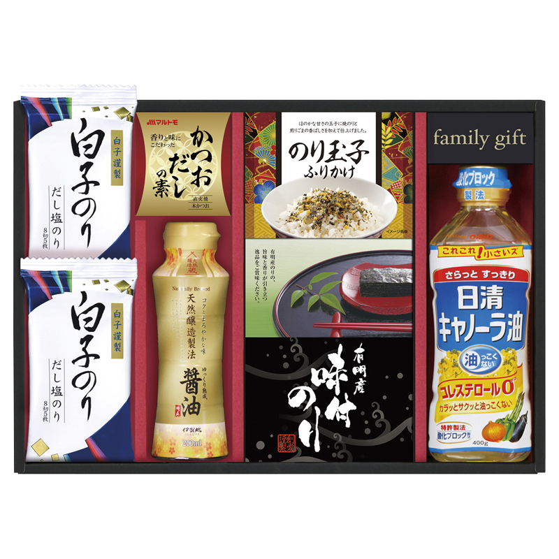 白子だし塩のり(8切5枚)×2、マルトモかつおだしの素(約4g×4袋)・のり玉子ふりかけ(約4.5g×2袋)・有明海産味付のり(8切8枚×2袋)・伊賀越天然醸造しょうゆ(約200ml)・日清キャノーラ油(約400g)×各1