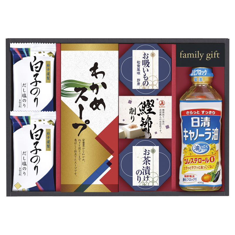 白子だし塩のり(8切5枚)×2、わかめスープ(約5.3g×4袋)・永谷園お吸いもの松茸風味(約2.3g×2袋)・永谷園お茶漬けのり(約4.7g×2袋)・鰹節削り(約1.5g×2袋)・日清キャノーラ油(約400g)×各1