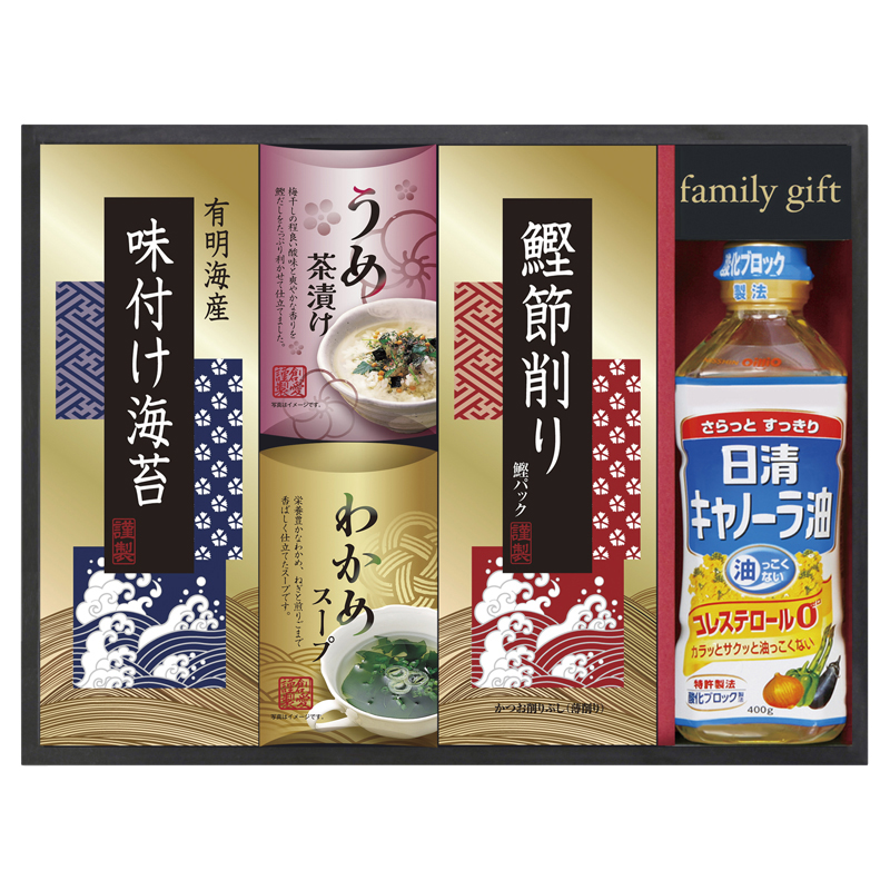 有明海産味付け海苔(3切6枚)・うめ茶漬け(約4.3g×2袋)・わかめスープ(約5.3g×2袋)・鰹節削り(約2g×4袋)・日清キャノーラ油(約400g)×各1