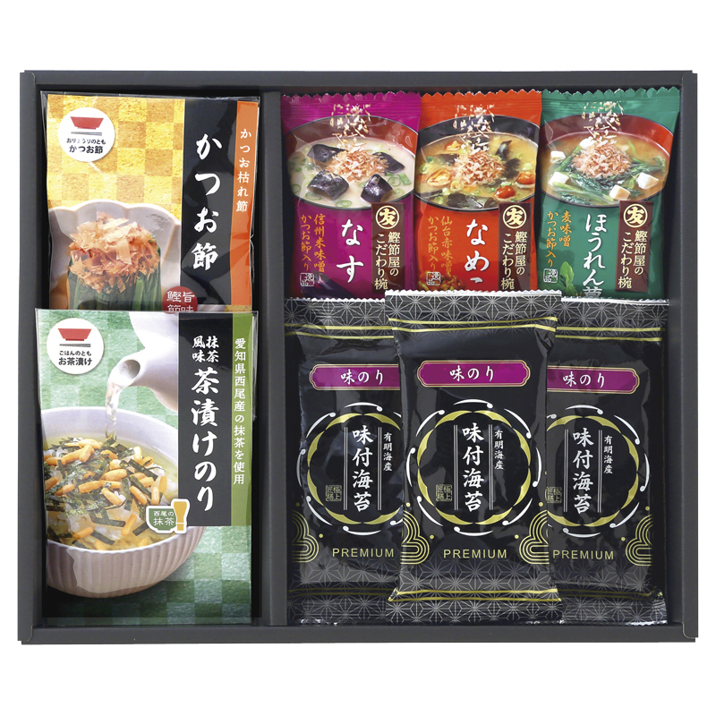 鰹節(約2g)・抹茶入りのり茶漬け(約5.6g)×各2、即席味噌汁(なす)(約7.4g)・即席味噌汁(なめこ)(約5.9g)・即席味噌汁(ほうれん草)(約7.5g)×各1、有明海産味付海苔(8切6枚)×3