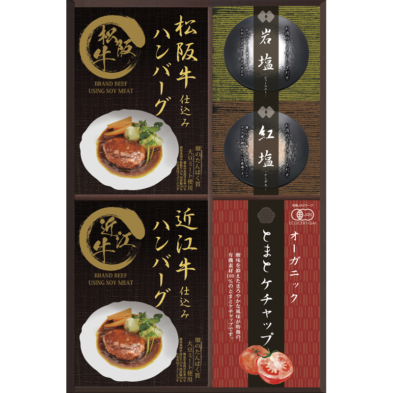 | 内容 | 松阪牛仕込みハンバーグ 大豆ミート入り(約130g)・近江牛仕込みハンバーグ 大豆ミート入り(約130g)・ジャーマニー岩塩(約30g)・アンデス紅塩(約30g)×各1、オーガニックトマトケチャップ(約10g)×8 |
