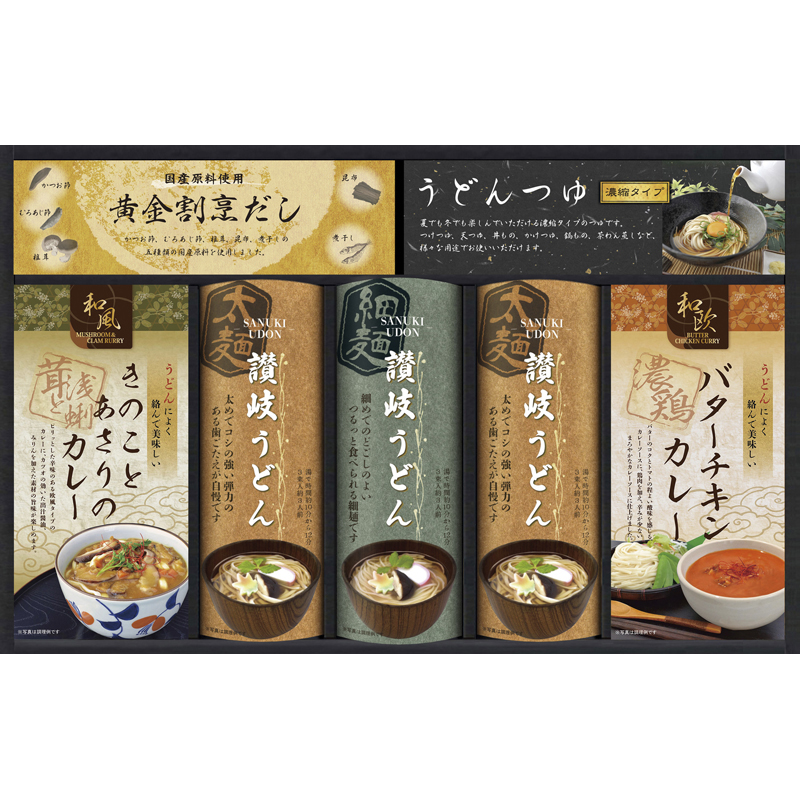 | 内容 | 讃岐うどん太麺(2〜3人前)(約300g)×2、讃岐うどん細麺(2〜3人前)(約300g)・うどん用きのことあさりのカレー(約200g)・うどん用バターチキンカレー(約200g)×各1、麺つゆ(濃縮タイプ)(約20ml)・黄金割烹だしパック(約8g)×各4 |