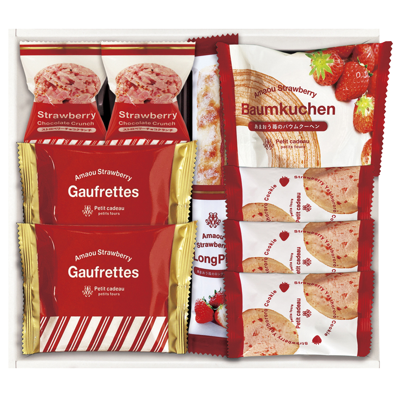 | 内容 | あまおう苺バウムクーヘン・あまおう苺ロングスティックパイ×各1、あまおう苺ゴーフレット・ストロベリーチョコクランチ×各2、焼きほろろイチゴクッキー×3 |