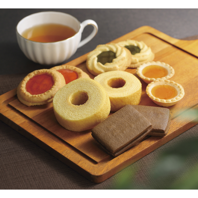 ミルク味のふんわりバウムクーヘンと、フルーツジャムが入ったクッキー、ココア味のサンドクッキー等のお菓子詰合せです。