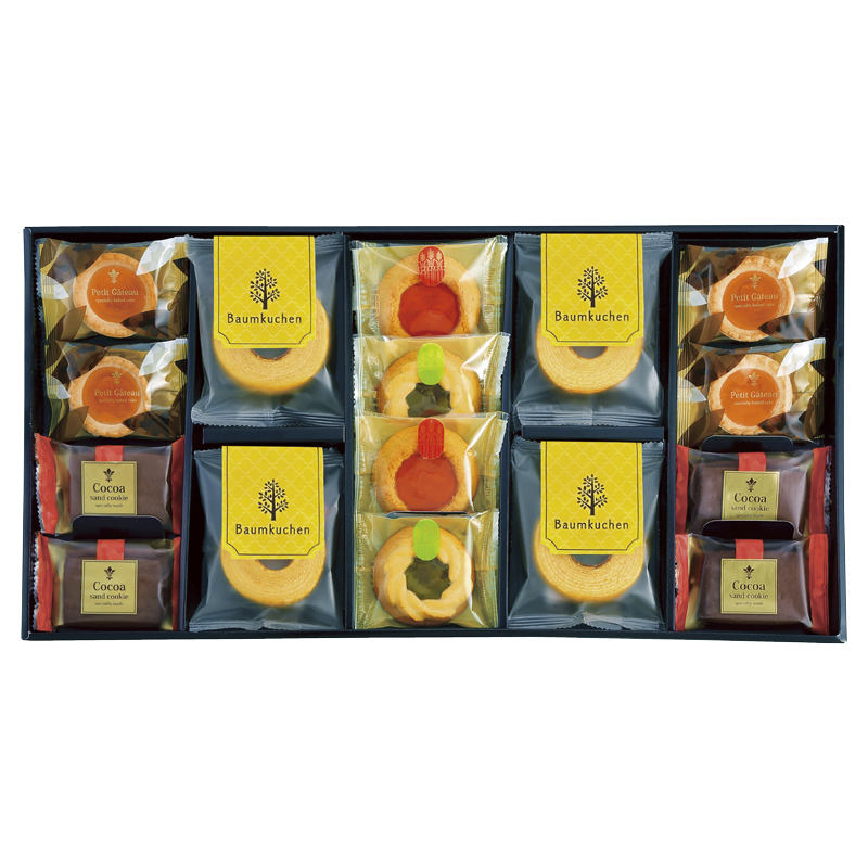 バウムクーヘン・プチガトー(オレンジ)・サンドクッキー(ココア)×各4、ロシアケーキ(キウイ・ストロベリー)×各2