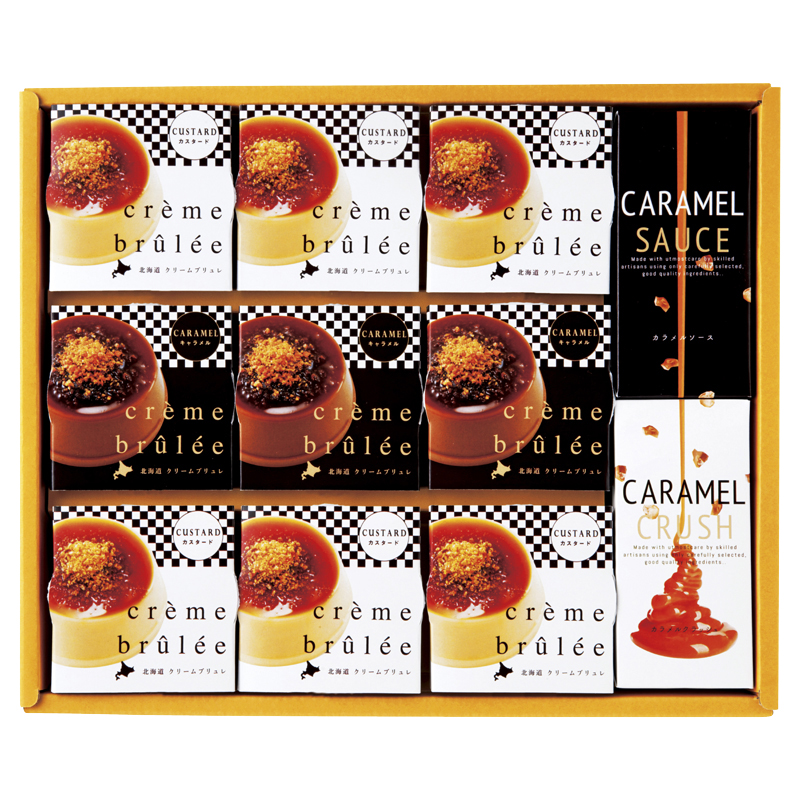 クリームブリュレ(約72g)×6、クリームブリュレキャラメル(約74g)×3、カラメルソース(約5g)・カラメルクラッシュ(約2g)×各9個