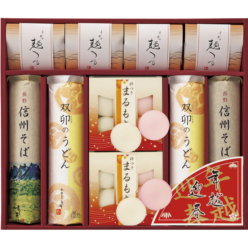 信州そば(150g)・双卯のうどん(150g)×各2、まるもち(白)(30g)・まるもち(紅)(30g)×各4、めんつゆ(30ml)×8
