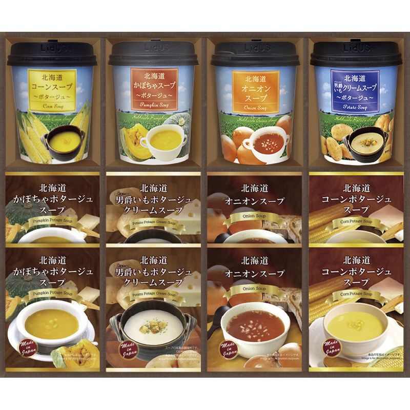 | コピー | 北海道の素材にこだわったスープやポタージュがお湯を注ぐだけで、簡単に美味しく出来るスープのセットです。 |