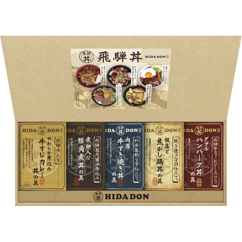 | 内容 | 飛騨牛仕込み牛すじカレー丼の具(約180g)・照り焼きマヨ仕立て根菜と焦がし鶏丼の具(約160g)・料亭風割り下仕立て牛すき焼き丼の具(約170g)・飛騨牛ミートソース仕立てWハンバーグ丼の具(約180g)・飛騨蔵元醤油煮込み豚角煮丼の具(約170g)×各1 |