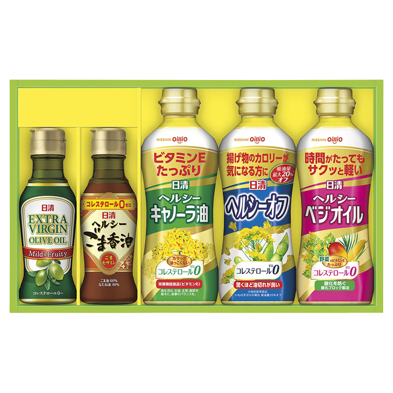 | コピー | 人気の一番搾りオリーブオイルとごま油、揚げ物の吸油量が抑制される「日清ヘルシーオフ」などのヘルシーオイルを詰合せました。 |
