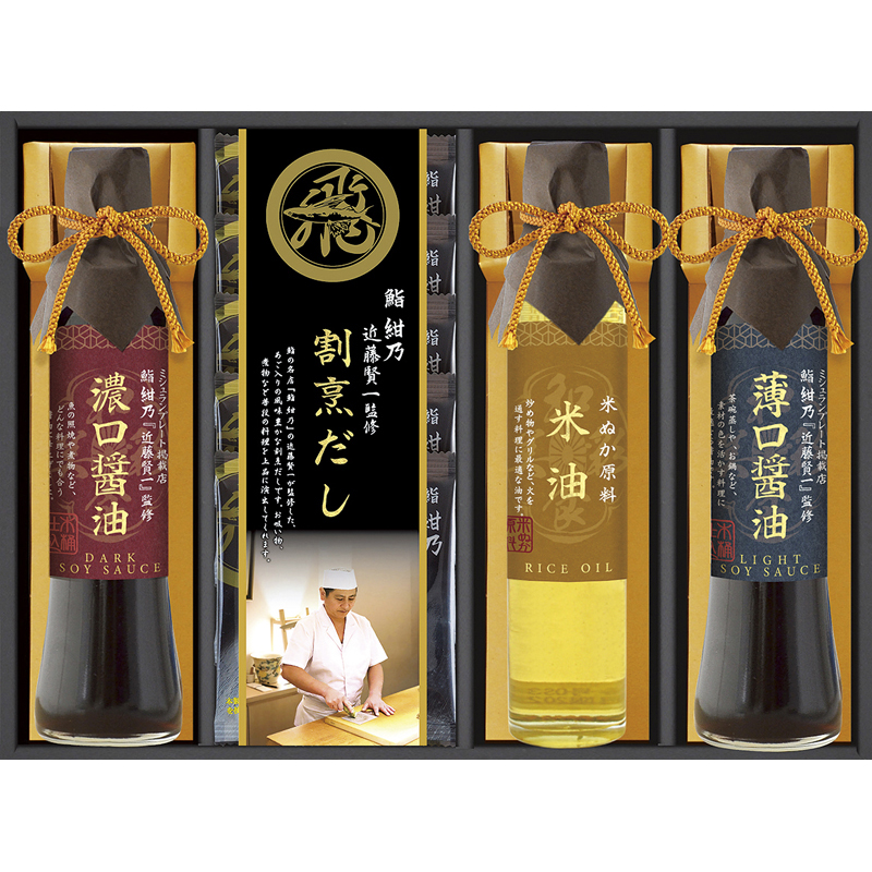 | 内容 | 鮨紺乃監修あご入り割烹だし(約8g×5P)・鮨紺乃監修飛騨高山濃口醤油(約200ml)・鮨紺乃監修飛騨高山薄口醤油(約200ml)・米油(約165g)×各1 |