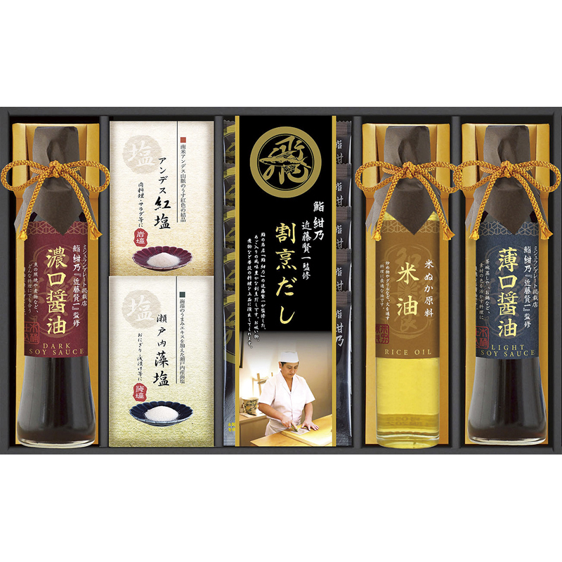 | 内容 | 鮨紺乃監修あご入り割烹だし(約8g×5P)・鮨紺乃監修飛騨高山濃口醤油(約200ml)・鮨紺乃監修飛騨高山薄口醤油(約200ml)・米油(約165g)・アンデス紅塩(約50g)・瀬戸内藻塩(約50g)×各1 |